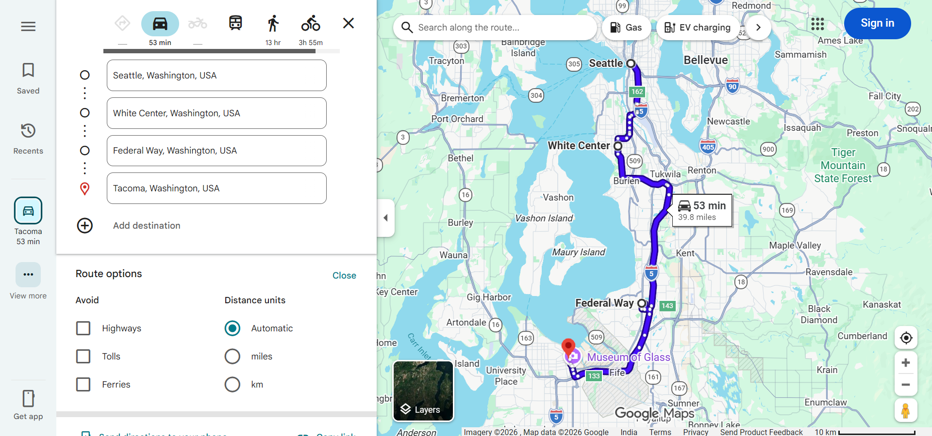 - Route Options — Customize your route by toggling options to avoid tolls, avoid highways, or avoid ferries. These preferences allow you to tailor directions to your specific needs and budget.